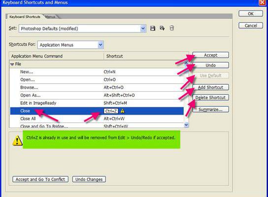 2. Nhấp CTRL và Z , thông báo cho biết Phím tắt nầy được dùng và sẽ loại bỏ Phím tắt CTRL+Z khi bạn sử dụng Edit > Undo / Redo nếu bạn chấp nhận.Nhấp Thẻ Delete ShortCut nếu không muốn tạo Phím Tắt mới cho CLOSE > Nhấp Use Default để trả lại Phím tắt mặc định cho CLOSE > Nhấp Accept nếu chấp thuận .
