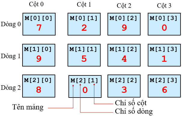 Các chỉ số dòng và cột cũng chạy từ 0->n-1