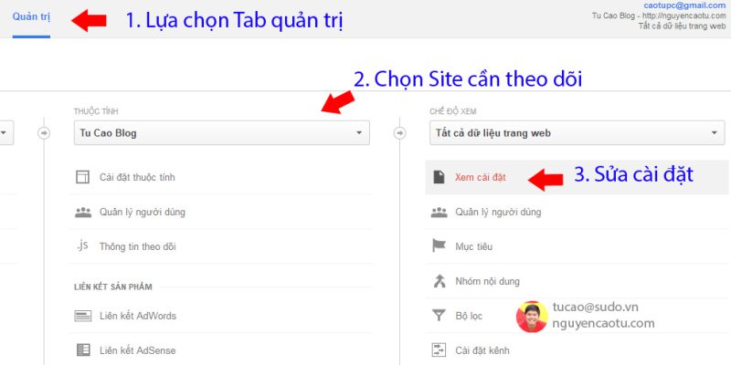 Bước 2: Nhấn vào Tab Quản Trị (nằm phía trên cùng), lựa chọn Website cần theo dõi