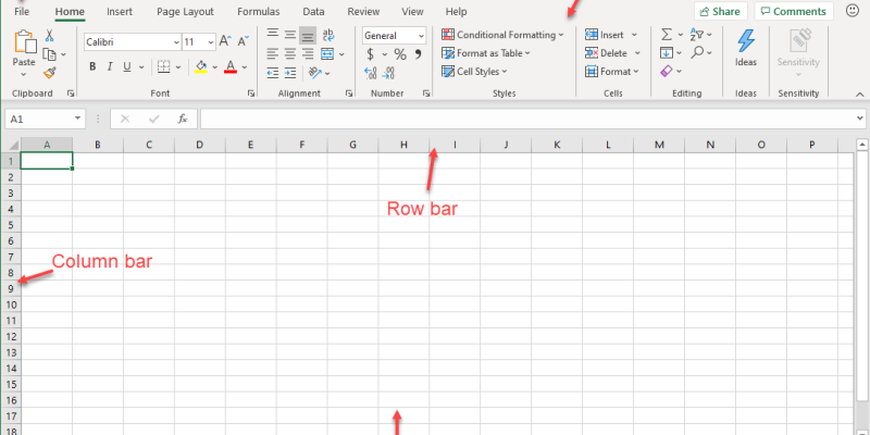 Thanh hàng ngang (Row Bar): Các hàng được đánh số từ 1 trở đi và tiếp tục tăng khi bạn tiếp tục nhập dữ liệu. Giới hạn tối đa là 1.048.576 hàng.