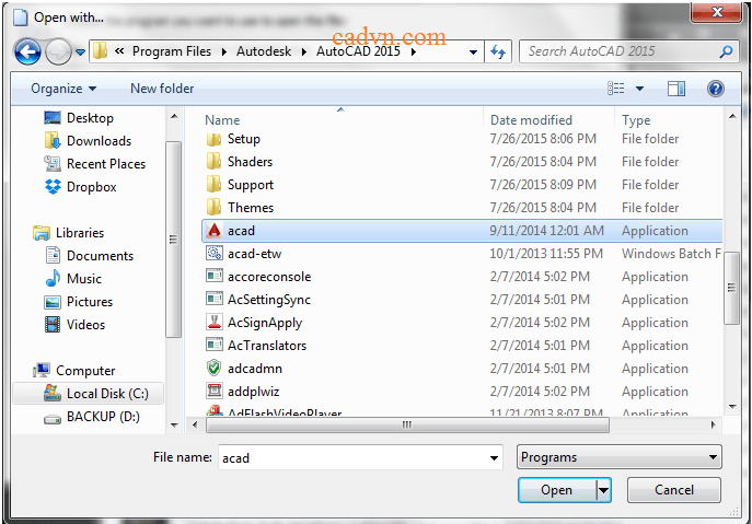 Thông thường chúng ta sẽ lựa chọn theo đường dẫn: C/Program Files/Autodesk/Autocad… rồi click chọn ứng dụng với tên acad