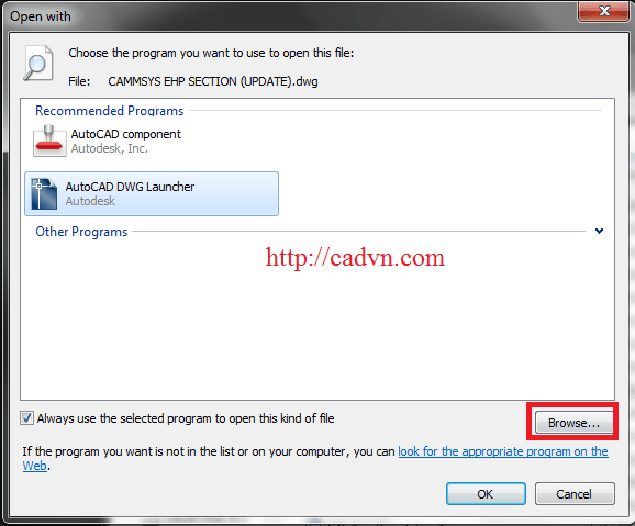 Với lựa chọn này, bạn đồng ý với việc luôn chọn ứng dụng Autocad để mở file .dwg những lần sau.