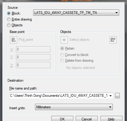 Tiện ích của Block tôi đã nói ở những bài giới thiệu về Block nên trong bài này tôi không nói lại nữa. Trong bải này tôi sẽ hướng dẫn bạn cách lưu block thành file để sử dụng cho bản vẽ khác. Tức là chúng ta sẽ lưu file block vào trong máy tính như một thư viện chúng ta tạo ra. Khi làm việc với những bản vẽ mới thay vì phải ngồi lập những block mới. Chúng ta chỉ việc vào thư viện rồi lấy ra gán vào bản vẽ là xong.