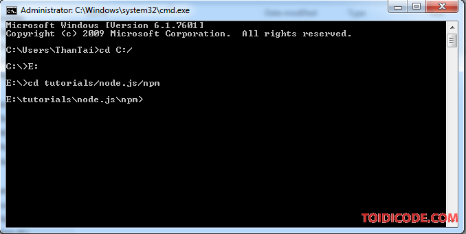 coffeescriptcopynpm init VD: mình sẽ khởi tạo một dự án trong ổ E có đường dẫn E:/tutotials/node.js/npm