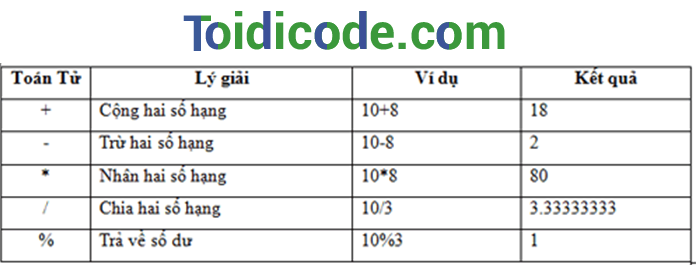 javascriptcopyvar name="Trần Như Nhộng"; Toán tử số học là 1 dạng phép tính giản đơn cộng, trừ, nhân, chia trong số học. Ngoài ra nó còn có thêm phép chia lấy dư (%) được sử dụng để lấy ra đơn vị dư của 1 phép toán