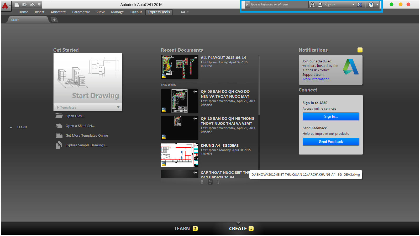 Nếu các bạn có một tài khoản trên Autodesk và thường xuyên sử dụng. Bạn thấy mục “Sign in” rất tiện lợi nhưng với đại đa số người sử dụng tại Việt Nam thì hầu như không sử dụng. Để tăng tốc độ của autocad 2016 thì loại bỏ mục “Sign in” cũng là một giải pháp tốt.