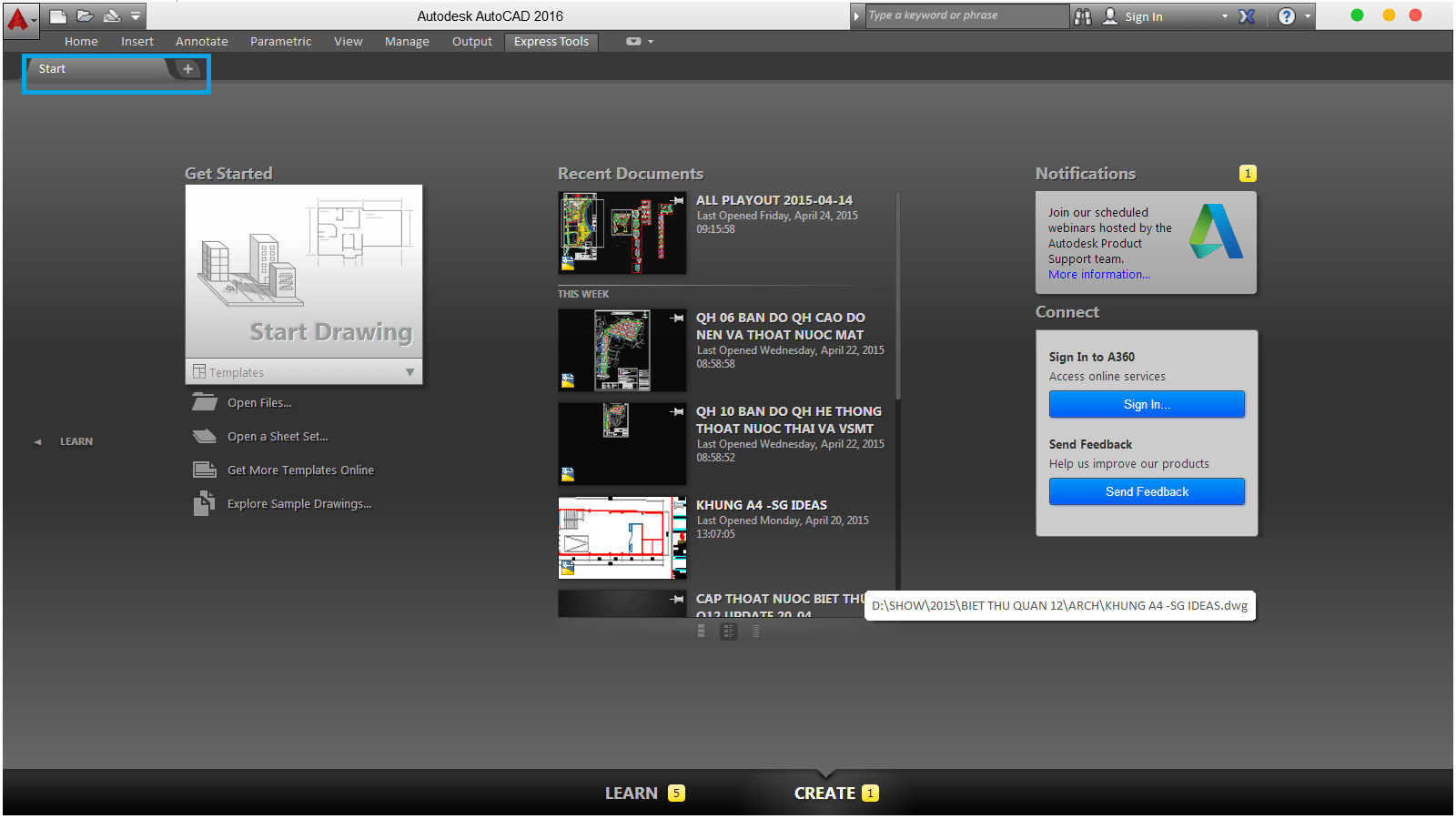 Khác với phiên bản autocad 2015, phiên bản autocad 2016 không cho cho chúng ta tắt cửa sổ làm việc Start trên thanh taskbar.