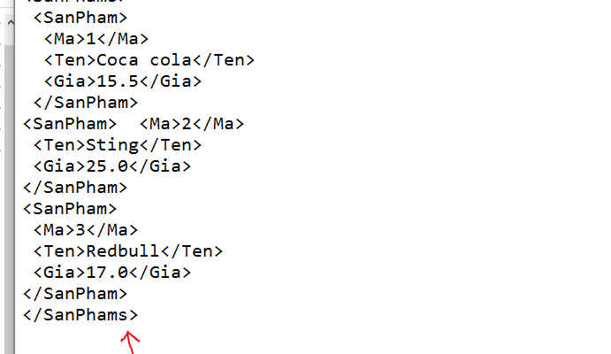 fun main(args: Array) { var data:MutableList = mutableListOf() var sp1=SanPham(1,"Coca cola",15.5) data.add(sp1) var sp2=SanPham(2,"Sting",25.0) data.add(sp2) var sp3=SanPham(3,"Redbull",17.0) data.add(sp3) var kqLuu= XMLFileFactory().LuuFile(data,"d:/dulieusanpham.xml") if(kqLuu) { println("Lưu text file thành công") } else { println("Lưu text file thất bại") } } Khi chạy hàm main ở trên thì ta có kết quả sau: