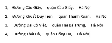 Ví dụ: Để tạo bảng văn bản dưới đây, mình đã dùng dấu phẩy để phân cách các vị trí chia cột và dấu phân đoạn để tạo thành một bảng có 4 cột 4 hàng.