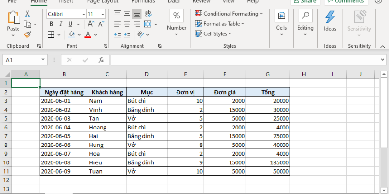 Ví dụ nhập một bảng dữ liệu trong Excel