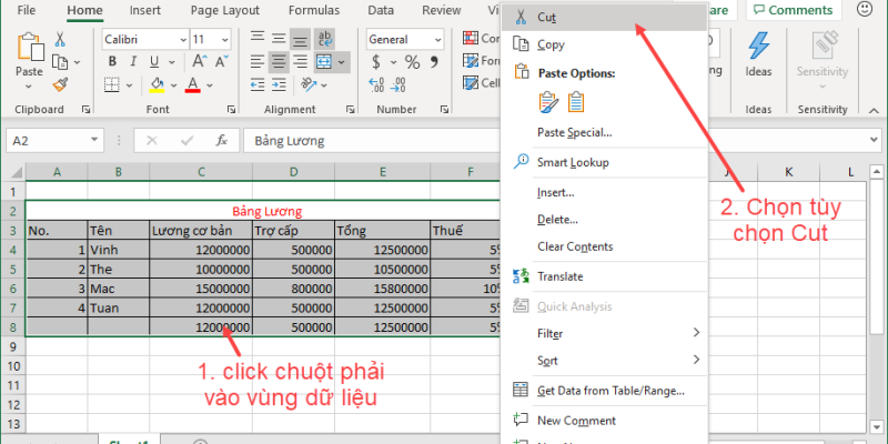 Bước 1: Chọn dữ liệu bạn muốn di chuyển. Click chuột phải và chọn tùy chọn Cut.