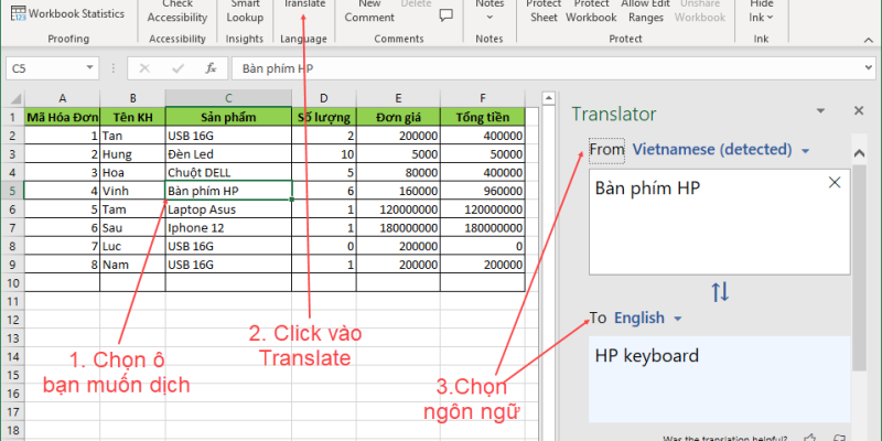 Bản dịch có sẵn trong tab Review của thanh Ribbon trong Excel. Bạn có thể nhanh chóng dịch ô sang ngôn ngữ khác với tùy chọn này.