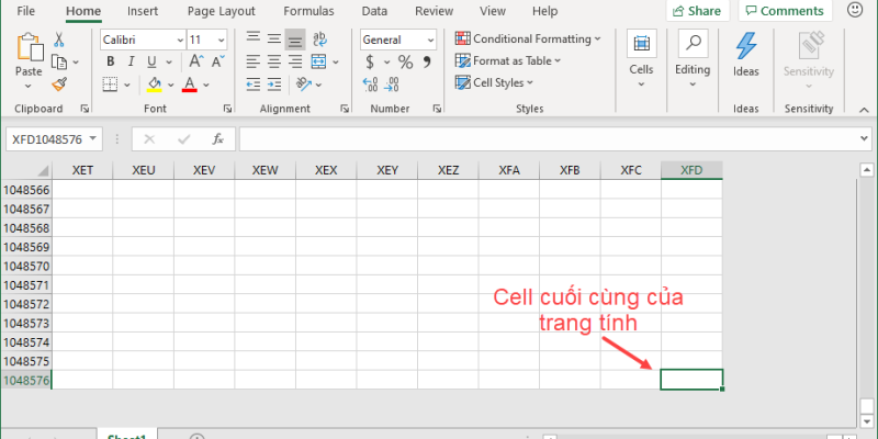 Đối với MS Excel 365, số hàng nằm trong khoảng từ 1 đến 1048576; trong tổng số 1048576 hàng và cột nằm trong khoảng từ A đến XFD; trong tổng số 16384 cột.