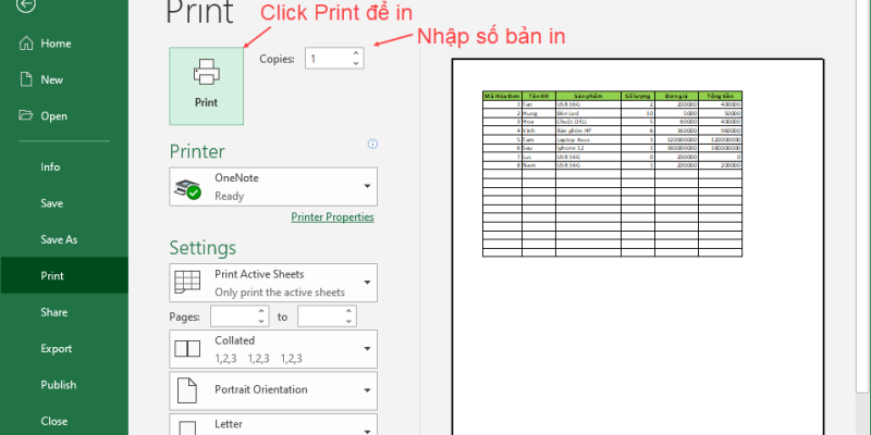 Nhấn tổ hợp phím Ctrl + P, sau đó click vào nút Print (hoặc nhấn Enter)