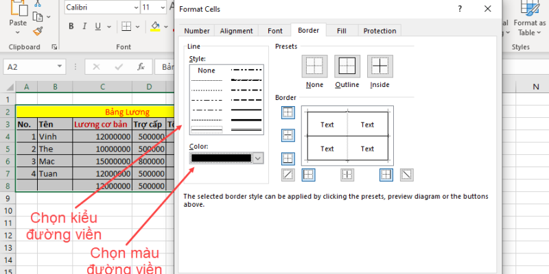 Để áp dụng đường viền, chọn phạm vi ô (range) → click chuột phải → thẻ Border → chọn Style cho border → click OK.
