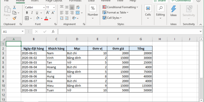 Ví dụ nhập một bảng dữ liệu trong Excel
