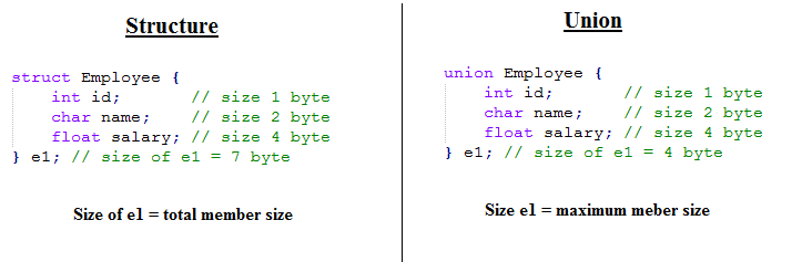 union employee { int id; char name[50]; float salary; };
