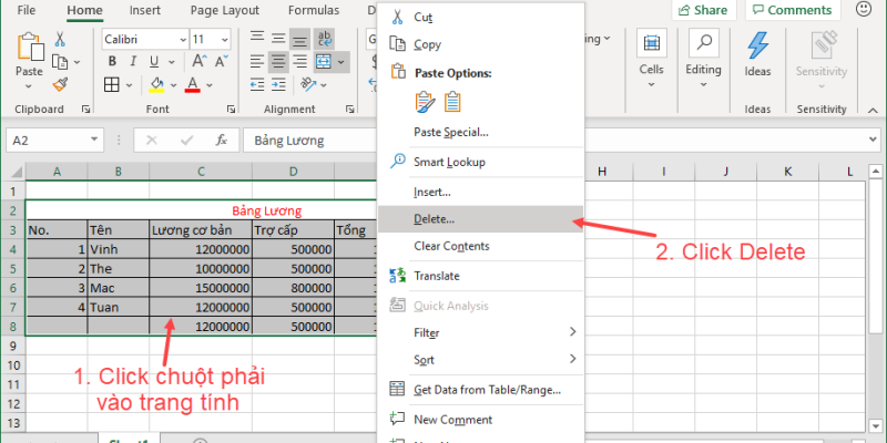 Chọn dữ liệu bạn muốn xóa. Click chuột phải vào trang tính. Chọn tùy chọn Delete, để xóa dữ liệu.